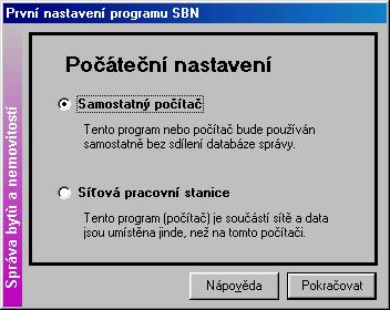 Volbu “Samostatný počítač” použijte také v případě, že jste program nainstalovali na první počítač v počítačové síti, protože program musí vytvořit potřebné databáze, které je možné následně umístit na jiný počítač nebo ostatním počítačům pak “říci”, že databáze jsou na tomto počítači.