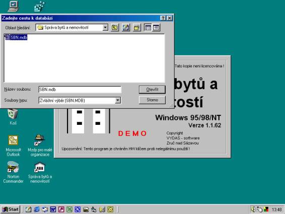 Databáze SBN.mdb obsahuje údaje pro provoz programu Správa bytů a nemovitostí. V databázi jsou uložena společná nastavení programu a umístění dalších databází Správy. Pokud není Váš počítač zapojen do sítě nebo pokud instalujete program v síti na první počítač, stačí, když při otevření dialogu pro výběr souboru SBN.mdb kliknete na tlačítko "Otevřít".