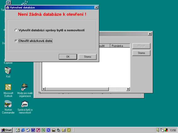 Po připojení dat se již program spustí a zobrazí základní pracovní okno. Toto okno nabízí vytvoření nových předpisů nájemného, zadání přijatých plateb, otevření agendy pasportů nebo vytvoření nového pasportu. Při prvním spuštění programu však toto okno potřebovat nebudeme, takže klikněte na tlačítko "Storno".