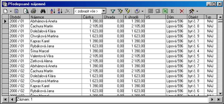 duplicity předpisů nájemného pro jednotlivé objekty, nájemce a zúčtovací